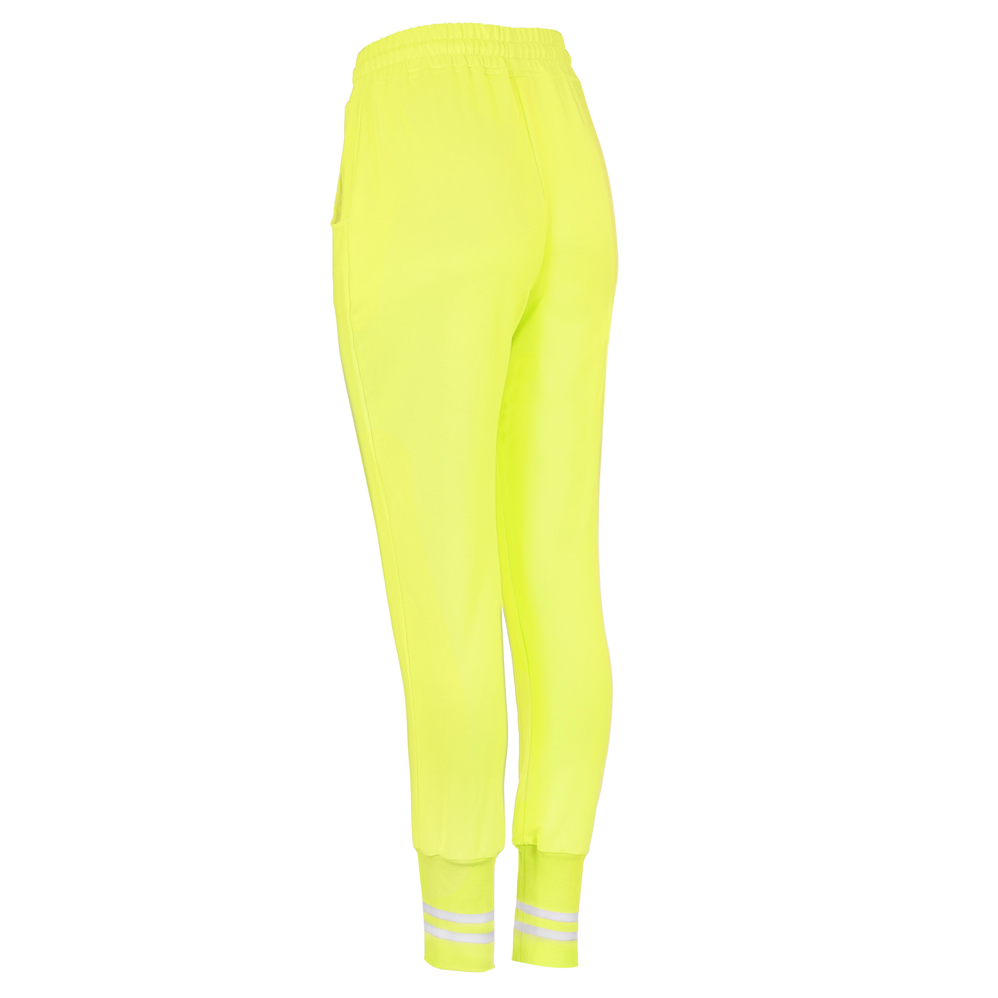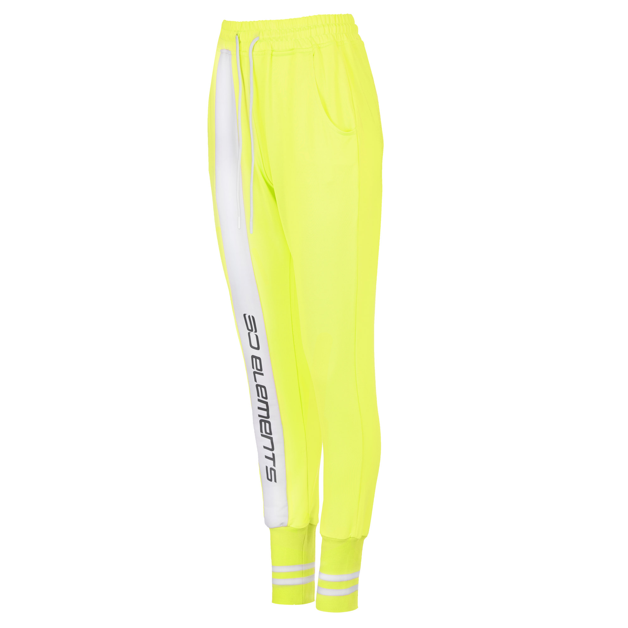 Дамски екип с асиметрична горница в предната си част.Широки маншети на ръкав и крачол,придаващи съвсем различен стил.Една съвсен нова визия,свежо съчетание на неоново жълто и бяло.Свободен силует,долнище с паднало дъно.Може да се носи панталона като 7/8 ,  както и ръкава на блъзата като 7/8