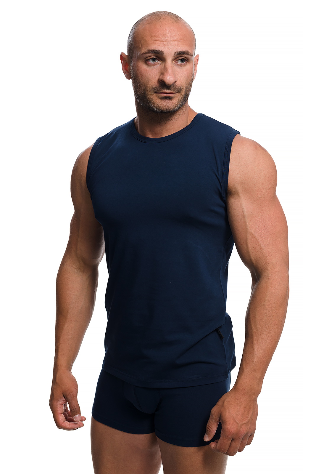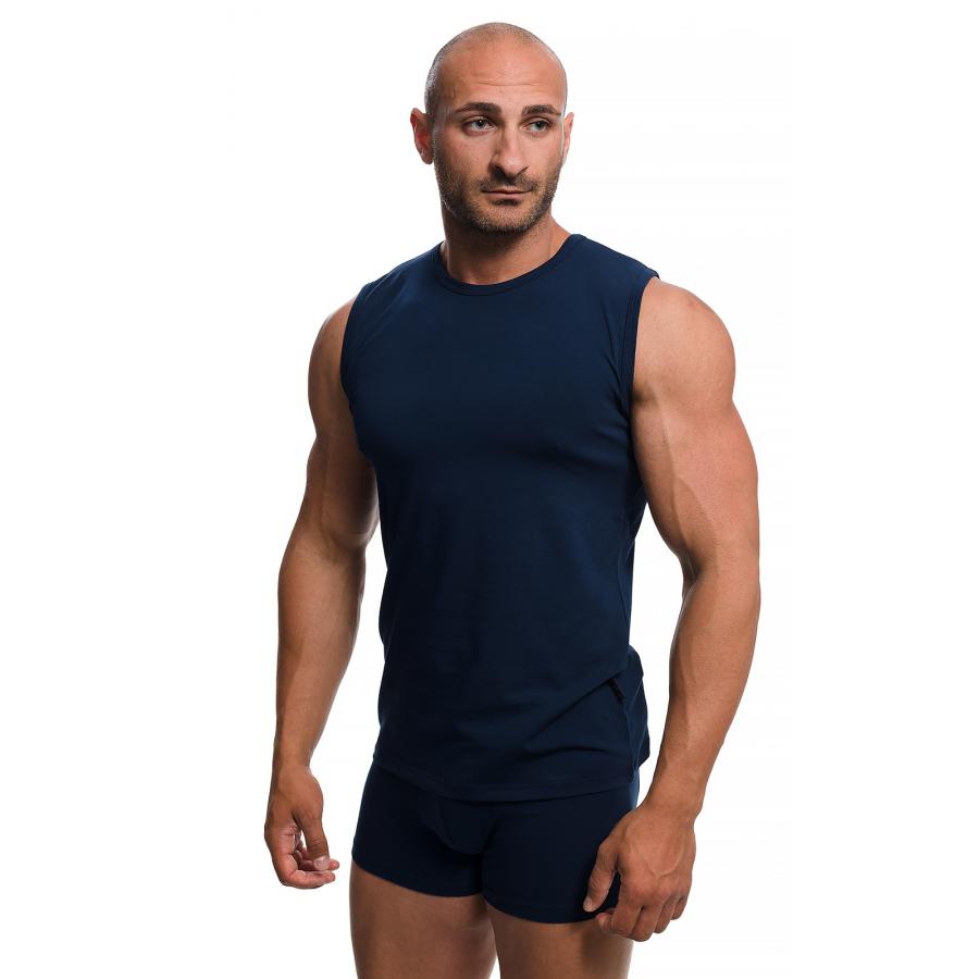 Семпла,изчистена,но елегантна мъжка тениска без ръкави, slim fit  модел,подходяща за носене под всяка дреха.Удобна за носене под дрехите през зимата и като самостоятелна дреха по време на спорт или в ежедневието.В състава на материята влизат памук и ликра,комбинира се с всякакъв вид дрехи и се поддържа лесно.Не запарва! ! Може да се комбинира с мъжки боксер от същия цват и материя.