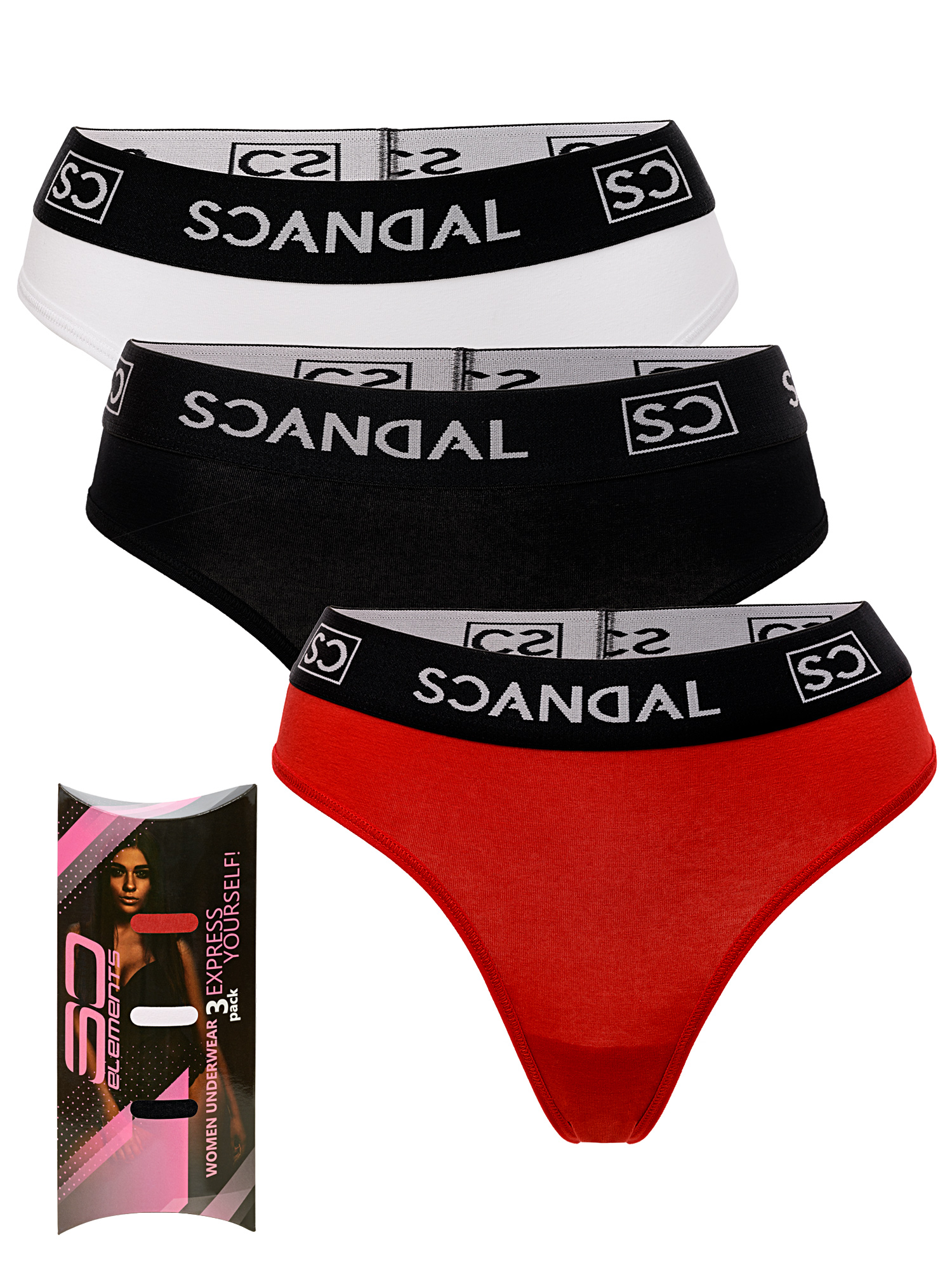 SC Elements underwear Бикини тип прашка- 3 броя в пакет.Меки ,памучни дамски бикини със широк брандиран ластик.Предлагат се в кутия по 3 броя – червен,бял и черен цвят.