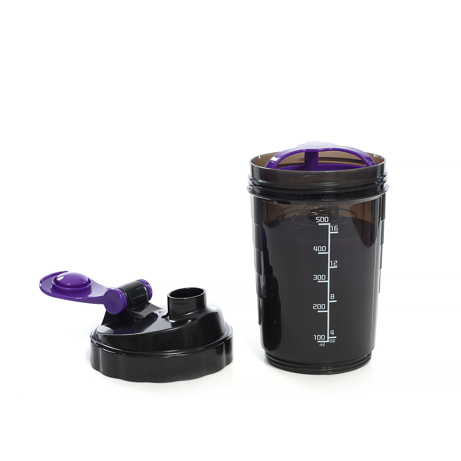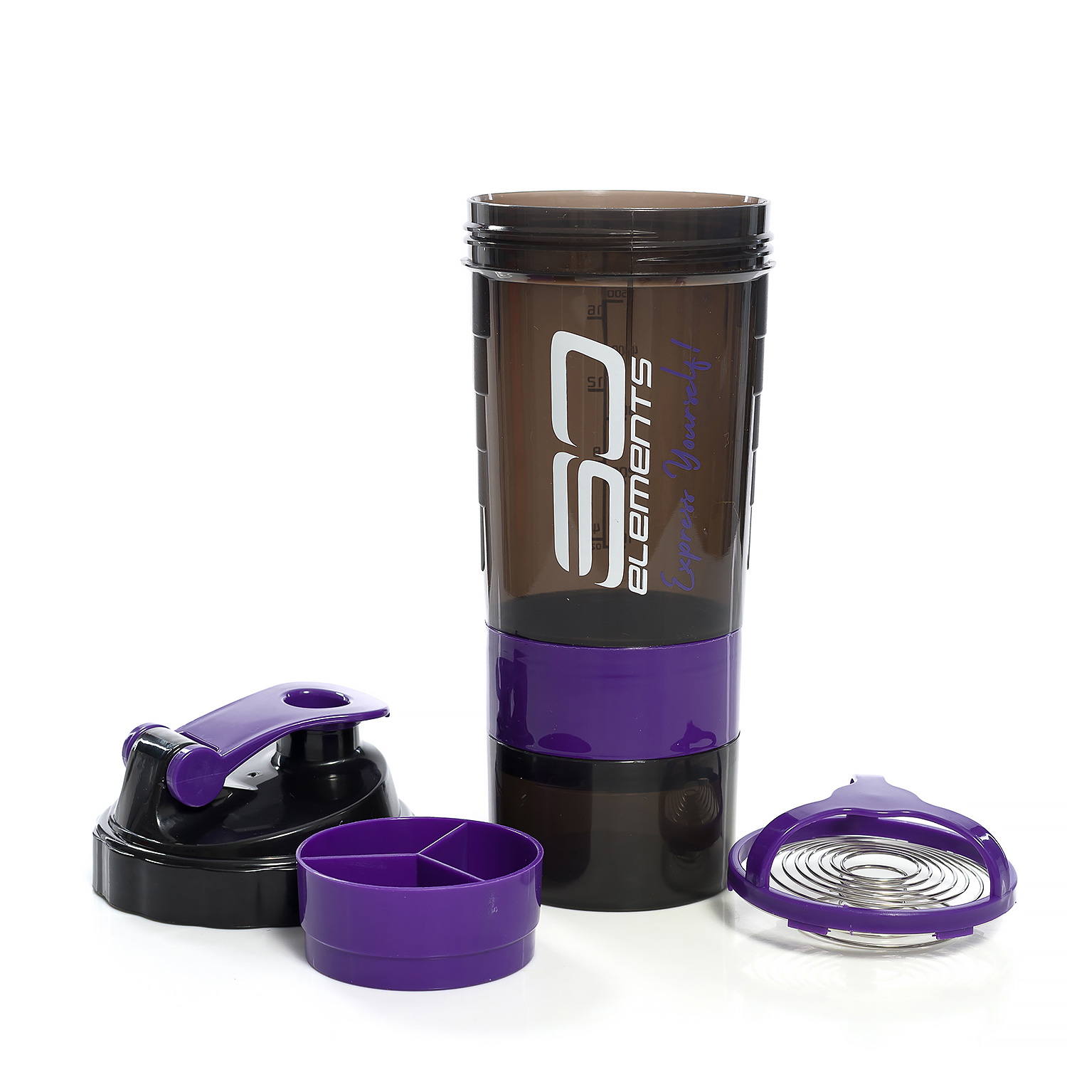 Шейкър-чаша с 3 отделения за хапчета,и отделен контейнер за 200 г. протеин на прах.
