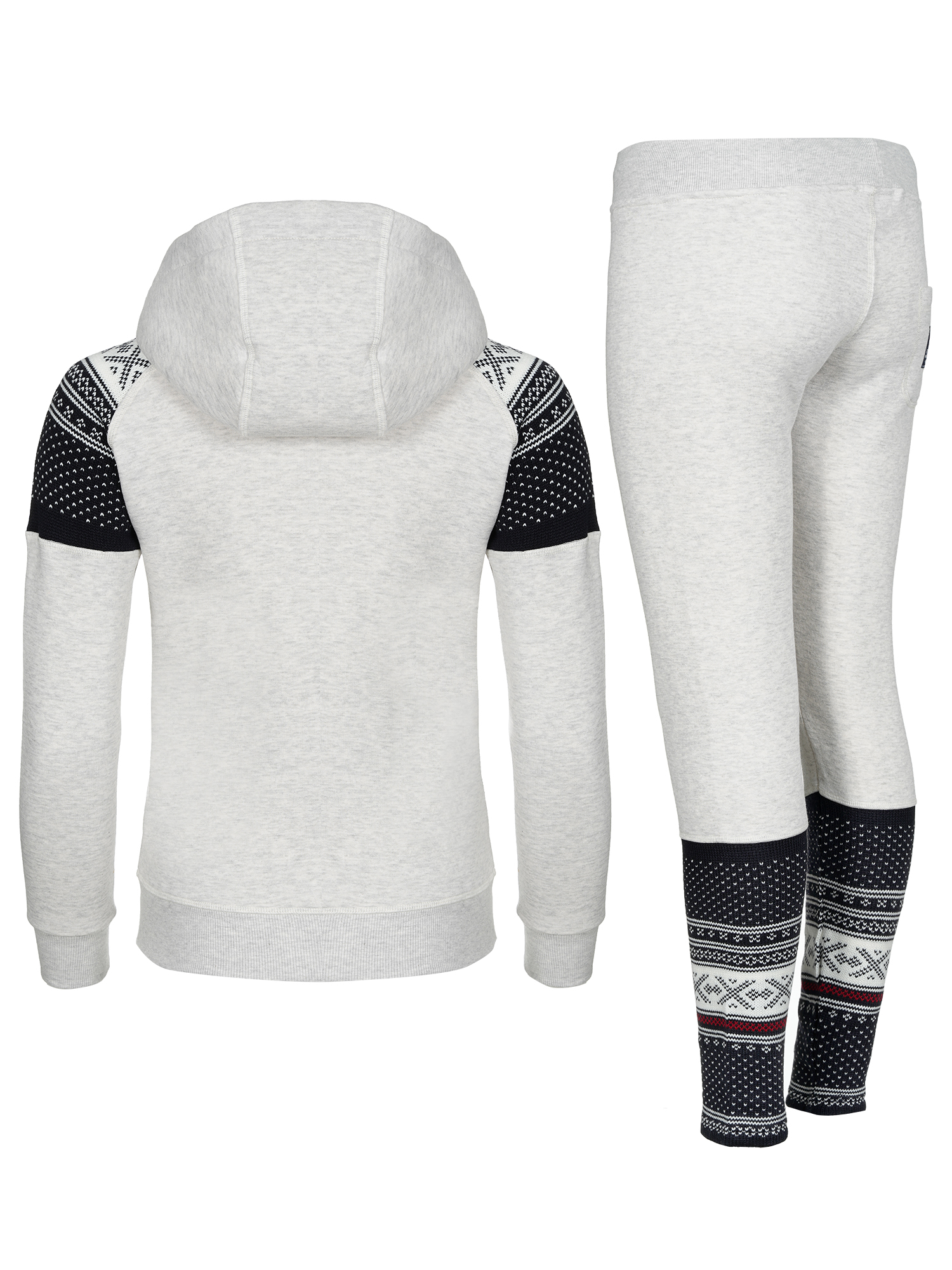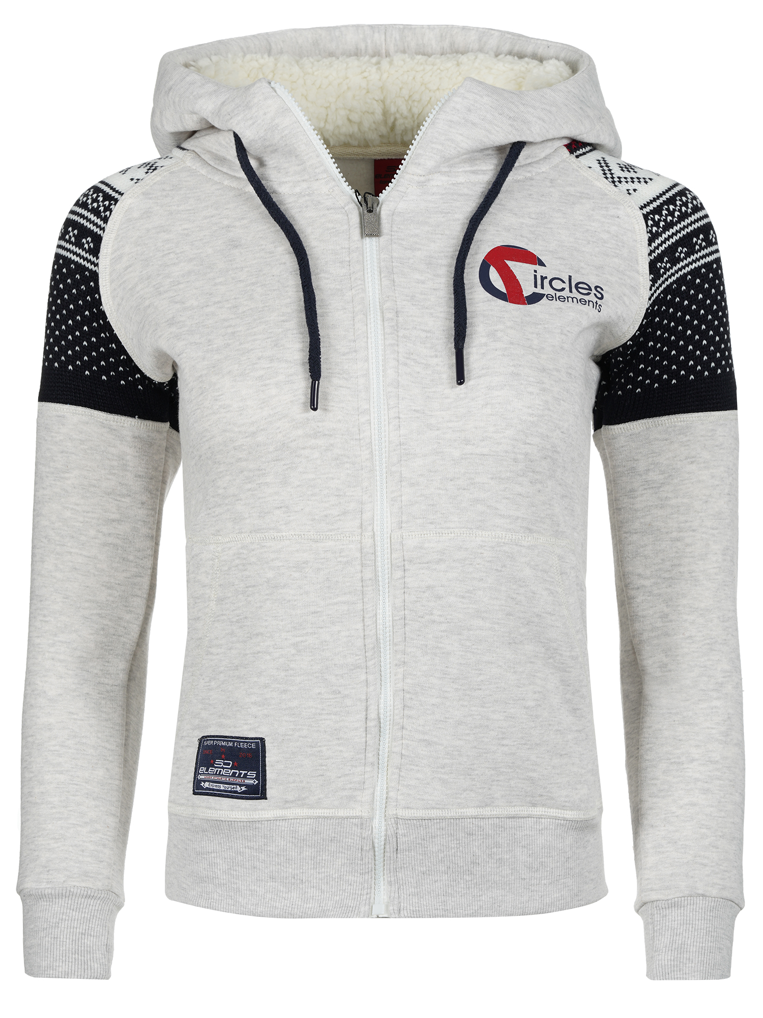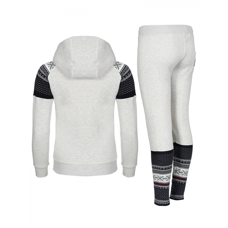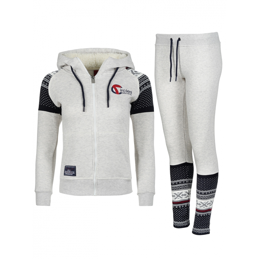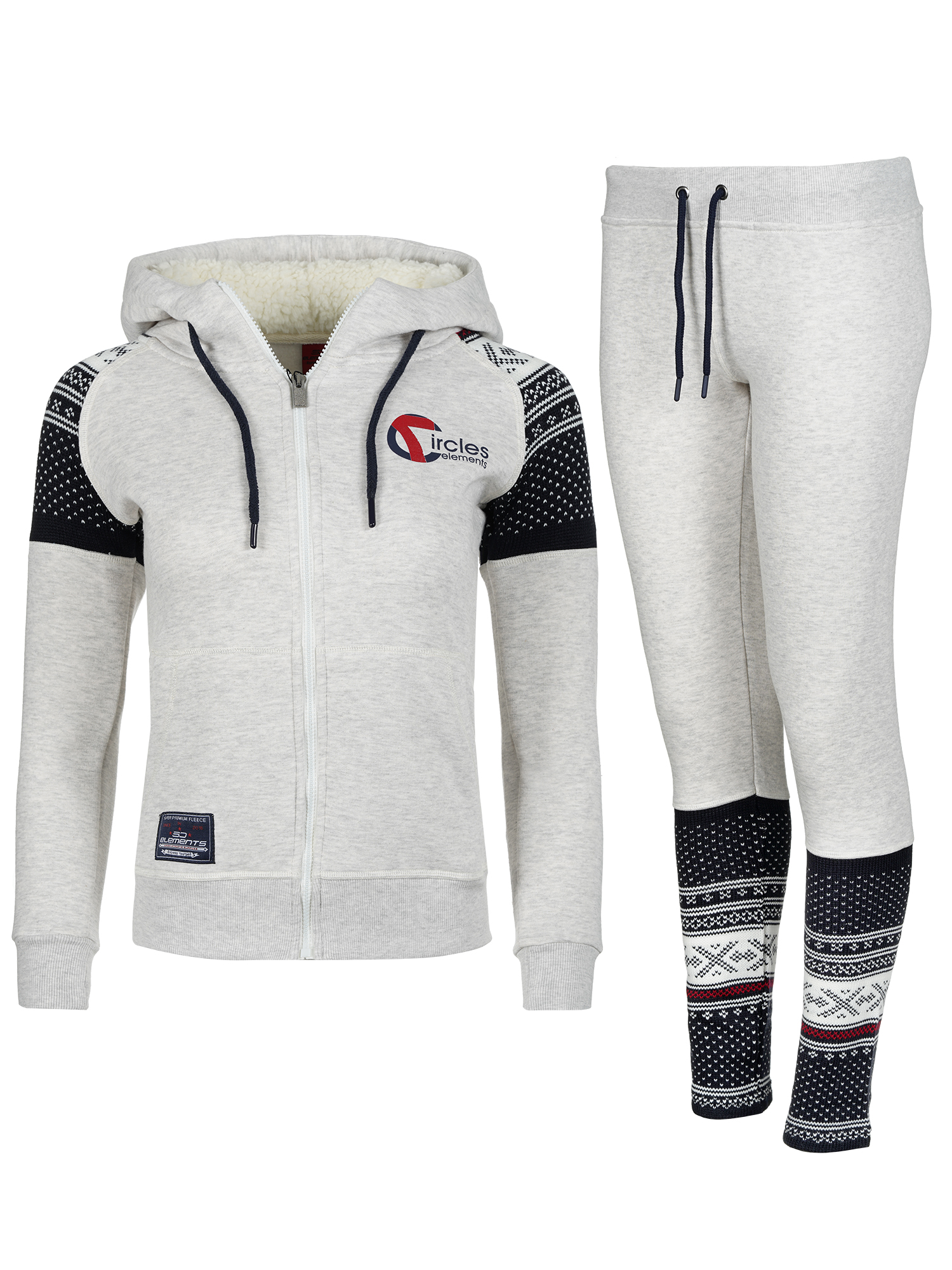 Суитшърт с голяма и пухена качулка,джобове тип „кенгуру“, долнището е с ластичен колан с връзки и заден джоб.