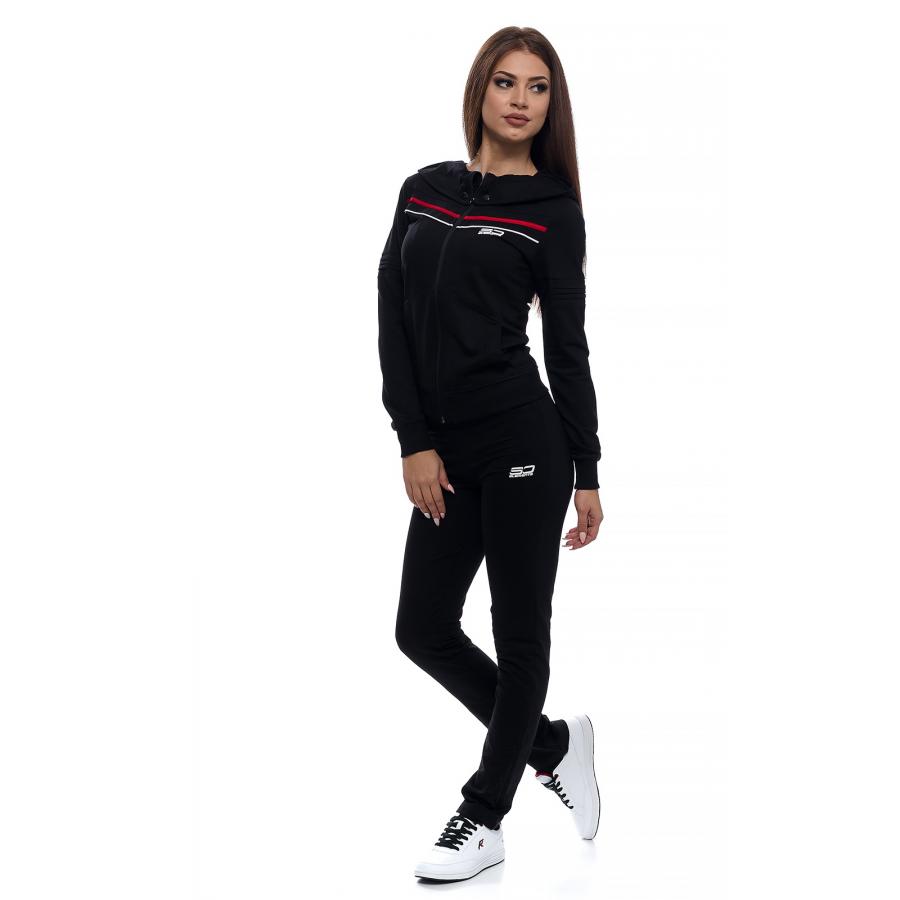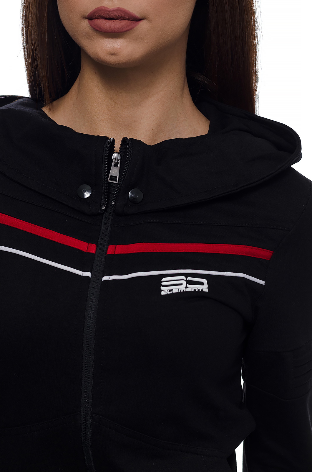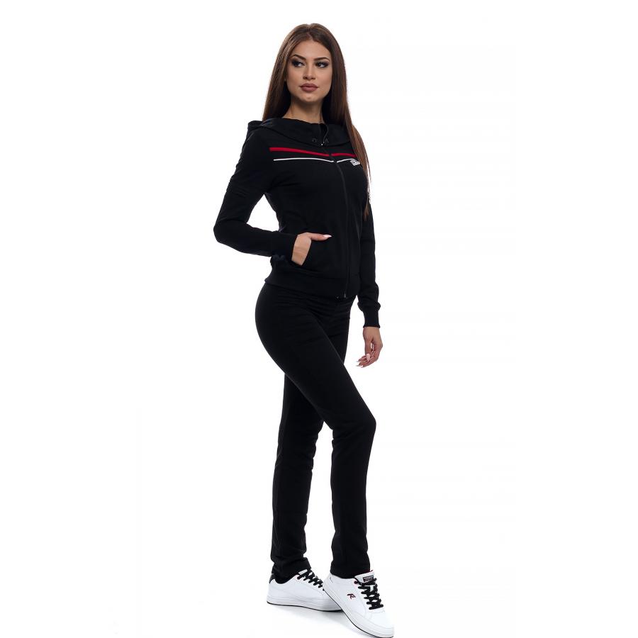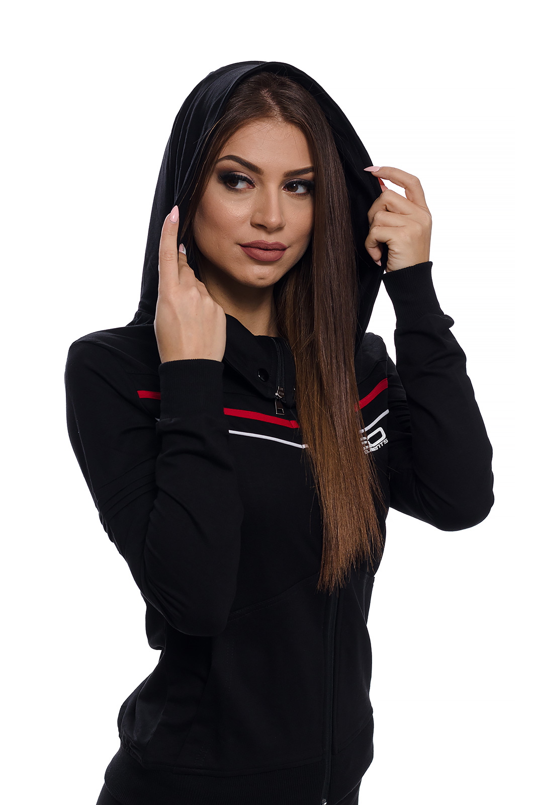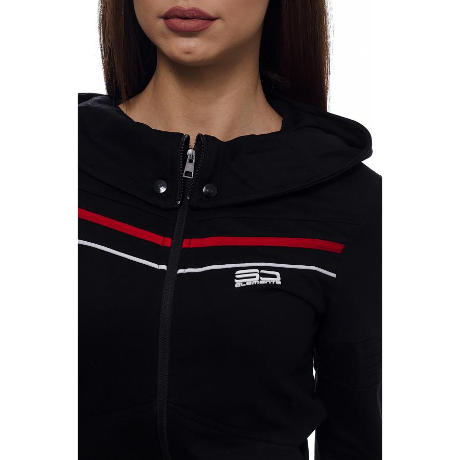 Дамски памучен екип с актуална визия, подходящ за спорт и ежедневие.С голяма качулка,трансформираща се в яка със закопчаване тип - тик так.
