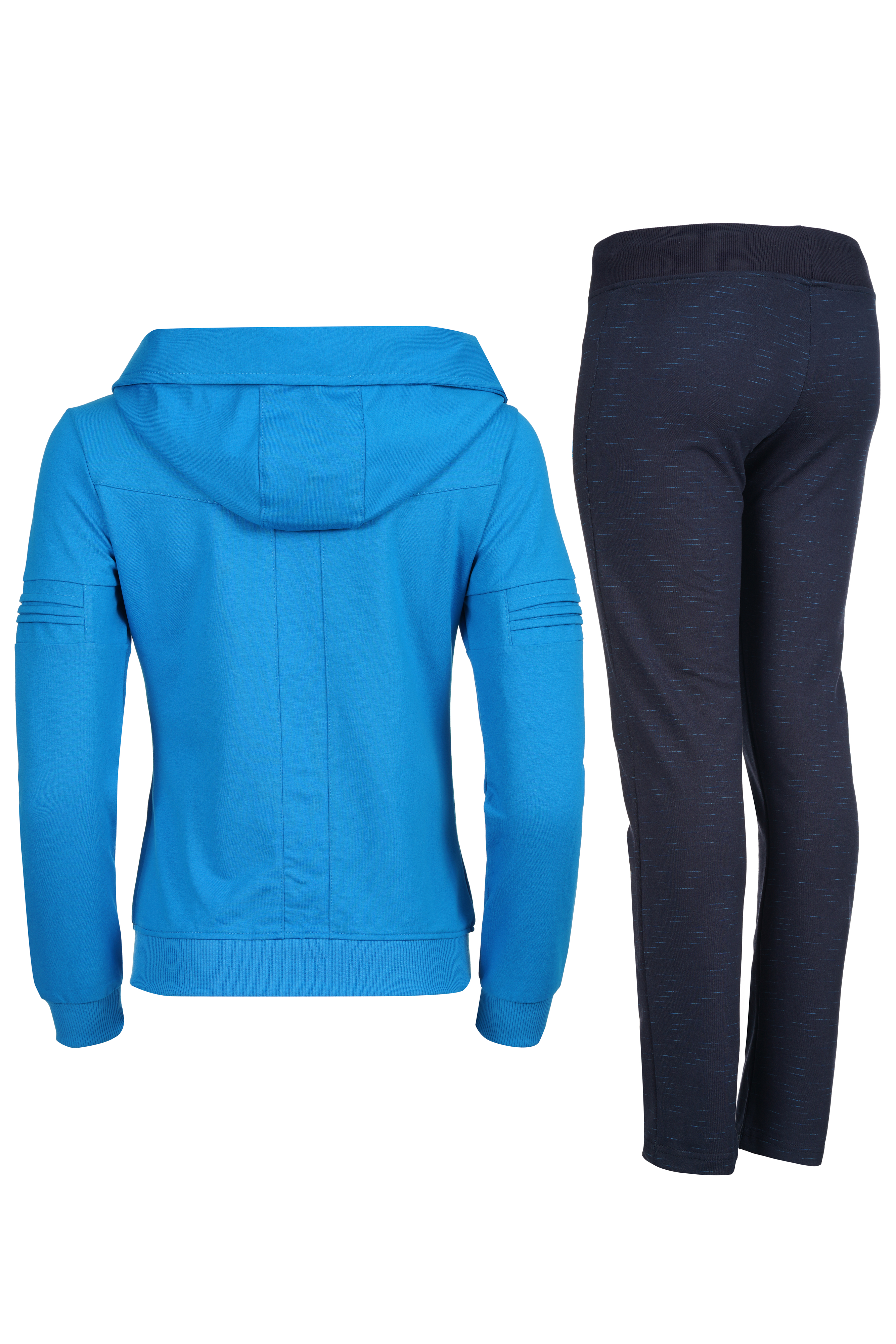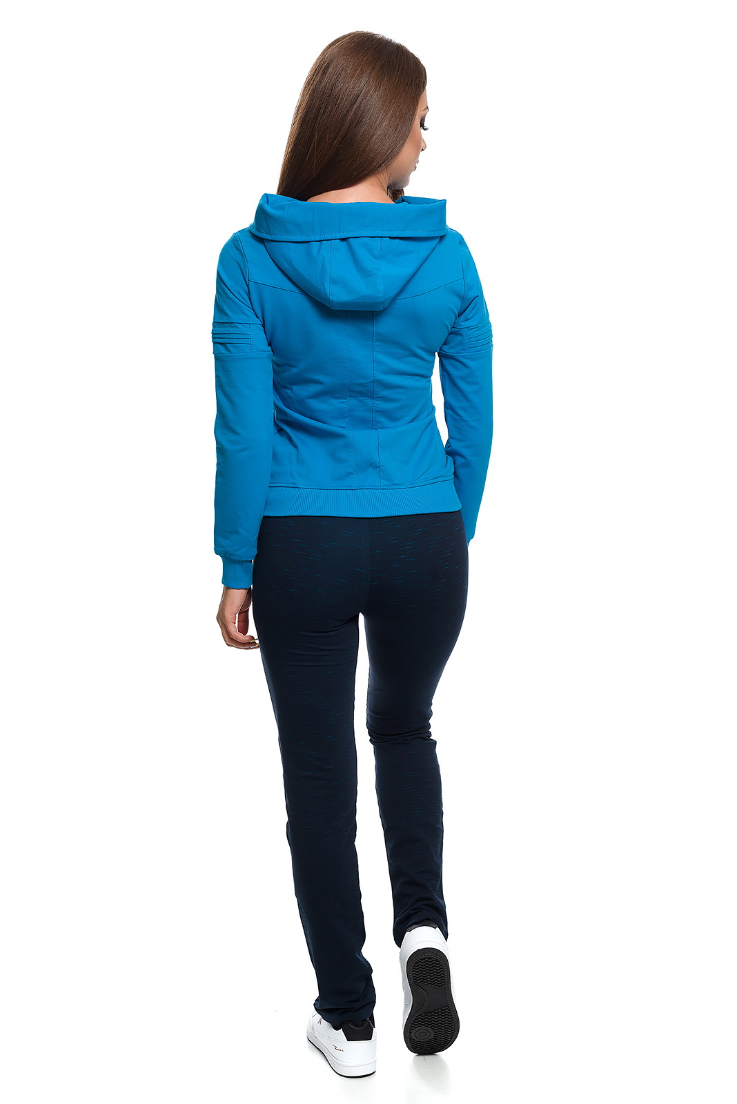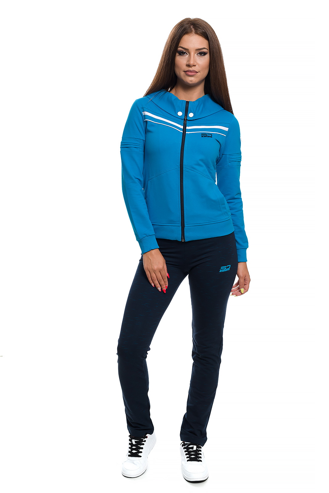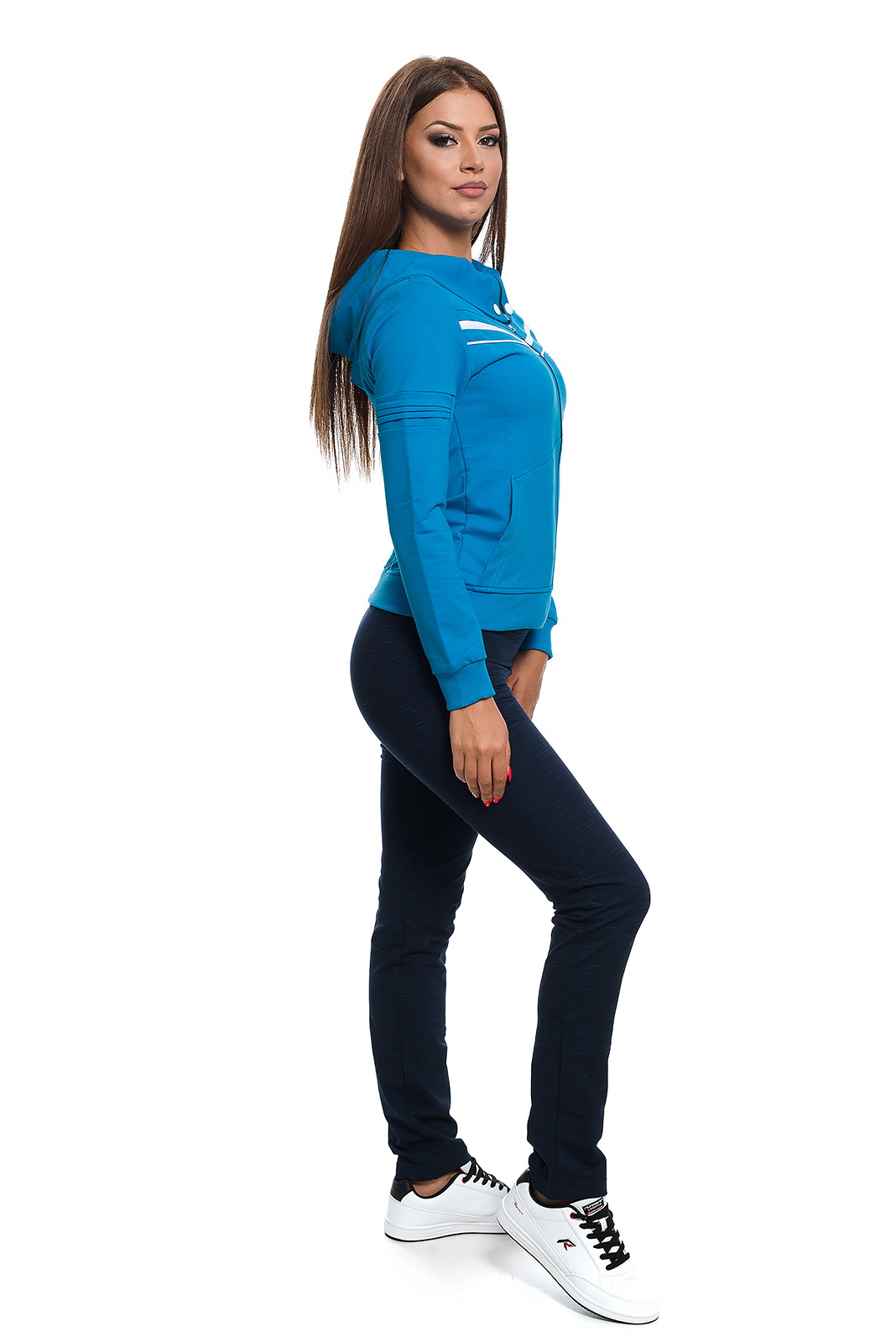 Дамски памучен екип с актуална визия, подходящ за спорт и ежедневие.С голяма качулка,трансформираща се в яка със закопчаване тип - тик так.